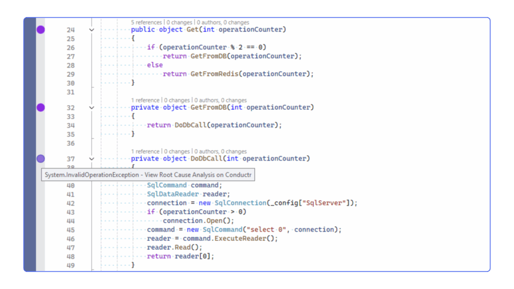 Conductr’s Root Cause Agent inspects the stack trace and understands the root cause of an error and its impact. Errors are analyzed according to their root cause with insights of the areas of application impacted. Eliminate duplicate error investigations and fix issues at their core faster.